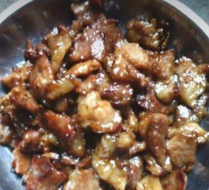 热火下油,油温7层热,把肉块下锅,翻炒出油,肉块金黄色关火,冷却一下,倒出多余的油。