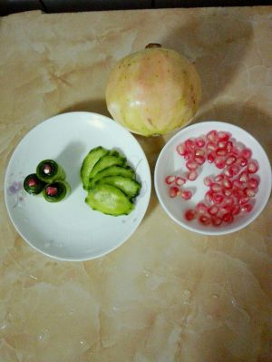 把不剥皮的青瓜刨三片,加少许盐抓一抓用凉开水洗净沥干水,把青瓜慢慢卷起。把剥皮的青瓜切片,把甜石榴切开备用。