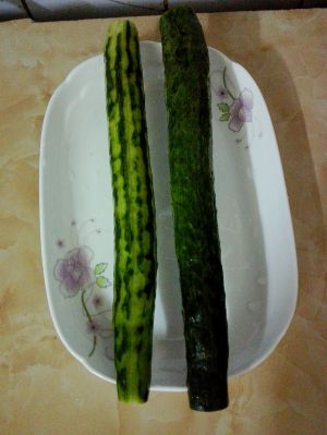 把两条青瓜洗净,一条剥皮,一条不剥皮备用。