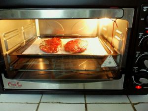 用低架 放腌好的肉 扫上一层剩下的调料 “快速加热” 250度 15分钟 10分钟后再两面涂一层剩下的调料 反转 再焗5分钟就可以了!