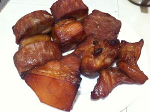 将五花肉切成丁,热㶽,倒入肉丁煸炒出油后,加入酱油,叉烧酱,蜜糖,起锅纳凉备用