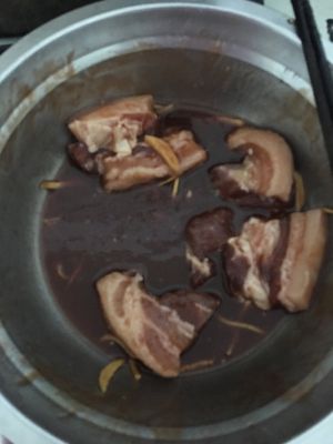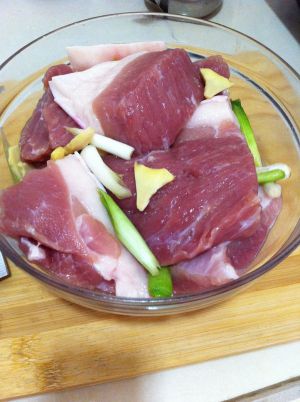 干锅下油 八成热放入姜丝炒香,将腌制的肉下锅炒均匀,加入酱油,冰糖,水没过肉炖十分钟放入盐、鸡精即可
