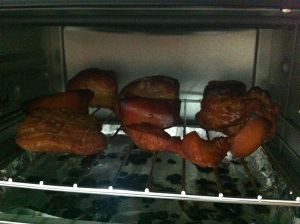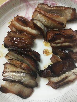 一条五花肉洗净切成小段,姜片切丝,放入料酒,拌匀后放入叉烧酱拌匀,(早上买菜回来就弄好)研制一下午用保鲜膜封好!(也可以研制到一夜,我一般都是早上腌制到下午烤)