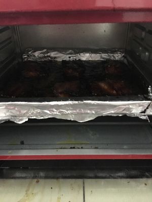 烤箱开到230,预热五分钟,烤盘上要垫好锡纸,200先烤五分钟,把酱料烤干后,拿出来刷蜂蜜,两面都要刷!180烤20分钟!拿出来翻面再烤20分钟,热度不能太大,会烤糊的!如果喜欢颜色深点中途可以再刷蜂蜜,但是一定要控制时间!很容易糊!