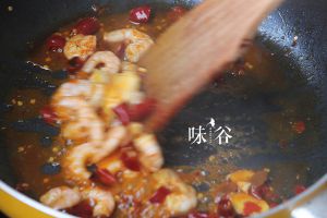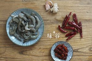 比平时多放点油,油热后,放虾炒,再放花椒和辣椒炒,再放蒜姜翻炒。加入盐、酱油、料酒、糖,大火收汁。