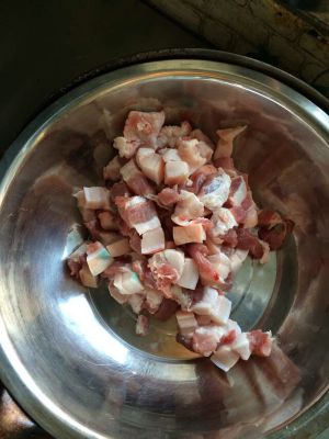 把五花肉切成麻将大小的块。 把五花肉冷水下锅,开火焯熟捞出备用。 锅中放油,然后加入适量的白糖。个人习惯是油和糖的比例为2:1