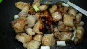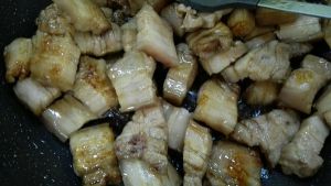 起锅,油热后加入白糖。炒出糖色,然后放入五花肉生姜片。翻炒上色。