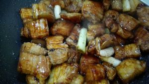 糖色炒好后要马上把肉放入翻炒,快速翻炒让五花肉均匀的挂上糖色。(这里要说一下,糖色炒好后需马上放入花肉翻炒,否则炒过了糖会发苦。另外一个需要注意的事情是在放入五花肉前,一定要把水份控干,不然会溅油烫伤。) 五花肉挂上糖色后,放入姜片,八角,花椒,桂皮翻炒一下。 放入酱油,接着翻炒均匀。