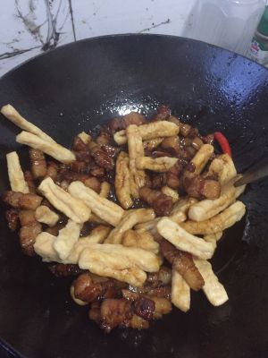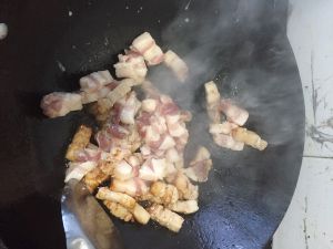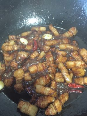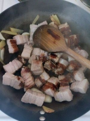 葱段、姜片下油爆香后把焯过的五花肉下锅翻炒,翻至肉色发白,加老抽、盐、糖、八角炒匀;