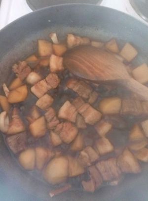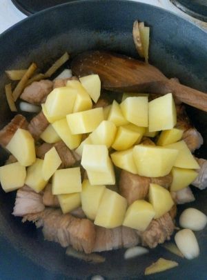 加入土豆,翻炒一会儿,加点儿白开水,炖。
