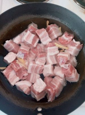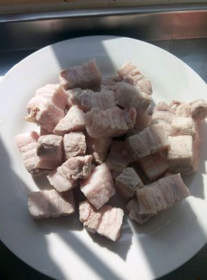 将新鲜五花肉切小块,开水焯过,控干水待用;