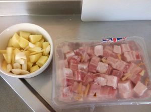 五花肉切块,放入姜丝,凉水泡着备用。土豆,大蒜,姜片切好备用。