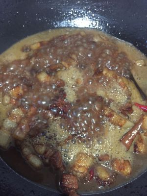 然后倒入刚才焯肉的水,末过肉后,开始加入各种调料,加一点点盐(因为加入的酱油类都是咸的,放盐多了红烧肉会咸),味精,十三香适量,倒入味极鲜适量,老抽适量上色,最后重点来了,一定要加入一块豆腐乳,成功的关键。盖上锅盖,大火开锅后,转小火炖20分钟。