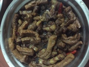 肉倒回锅里,翻炒一会儿,加入老抽生抽和陈醋,继续翻炒。