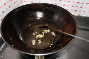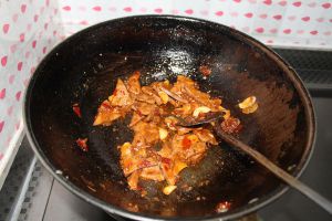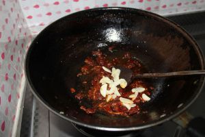 加入一勺豆瓣酱,不停的翻炒,炒出豆瓣酱的水份,加一小勺糖,加入蒜片接着炒,炒出红油。
