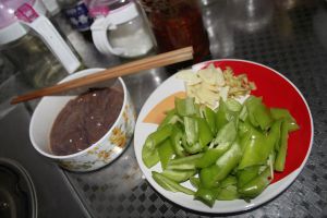 然后在猪肝中加入料酒,少量酱油和白糖,搅拌均匀,最后加入淀粉,搅拌好备用,同时将尖椒切块处理好。