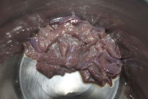 肝切成小片状,然后清水多洗几次,洗完泡白醋