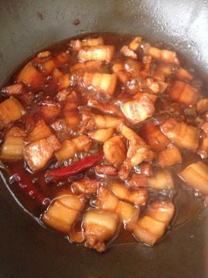 热油锅,倒入改刀的猪肉,加老抽上色,加入冰糖、生抽加水小火慢熬
