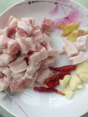 准备好材料,五花肉切成小方块,对了还有干辣椒。也可以不放。