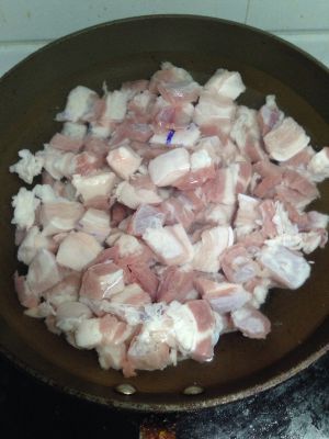 把焯过水的五花肉倒入,和糖一起翻炒。