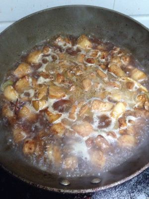 小火焖烧45分钟后,倒入土豆继续焖烧。