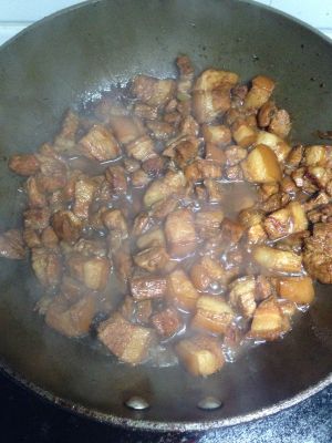 五花肉捞出,沥干水,热锅放入五花肉,煸出油后捞出猪肉,放冰糖炒糖色,下肉均匀上色,然后下姜片,蒜片,辣椒,葱丝,翻炒均匀,下酱油,老抽,盐,翻炒后倒入啤酒一瓶,大火烧开,小火四十分钟。