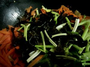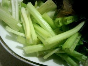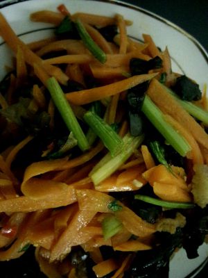 加入木耳丝,芹菜段,适量盐,还有两勺陈醋和两勺生抽。继续大火快炒3分钟。