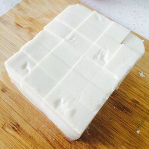 将盒装豆腐用小刀切成小块,滑入汤中。