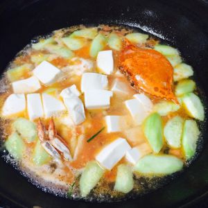 锅里下底油 放入葱姜爆香 下番茄炒成红酱 下丝瓜和蟹 加水煮 再放入豆腐 加盐调味即可