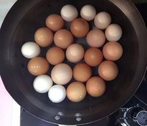 用湿毛巾把鸡蛋擦干净,放到锅里煮,一定要用凉水哦,水要没过鸡蛋。