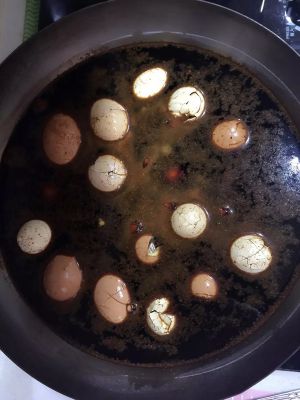 锅中放入水、茶叶煮开。放入全部调料,盐和酱油一个人口味,煮开后放入鸡蛋,转最小火煮40分钟。