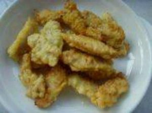 这个时候的鸡肉也已经腌制好了,把葱姜捡出去,鸡肉条一根一根的放入大碗中,让每一根鸡肉条都均匀地包裹上面糊。
