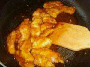 把里脊条放进锅里,翻炒均匀,让每一条鸡胸肉都要沾满糖醋汁儿。