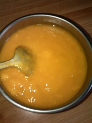 动物淡奶油隔冰打至6分发、体积膨大至2倍 但可以流动、加入芒果泥搅拌均匀