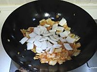 在锅倒入油,油热后加入两勺辣白菜,炒软炒出香气(这照片拍的)