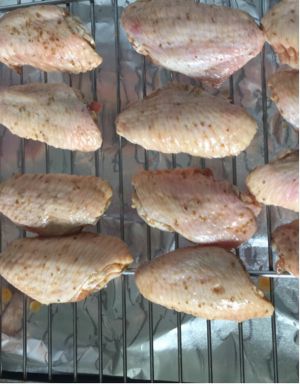 烤箱提前10分钟预热到180度。将鸡翅间隔一定空隙摆放在烤网上,下接烤盘铺好锡纸。入烤箱中层烤15分钟;