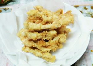 鸡胸肉切条加黄酒炸鸡粉嫩肉粉腌制15分钟,然后用生粉裹好放油锅炸好装盘