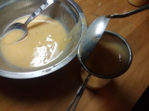 把搅匀的芒果汁过滤一下。