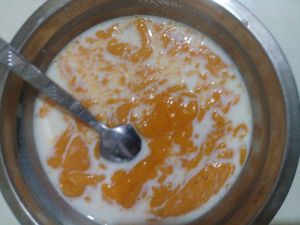 打好的芒果泥倒在牛奶里搅均匀。
