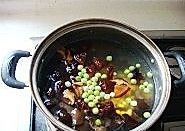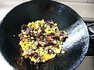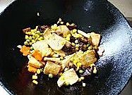 起锅,放葱,炒出香味后,将(香菇豌豆玉米胡萝卜)和木耳入锅煸炒一下,然后再放入豆腐片。