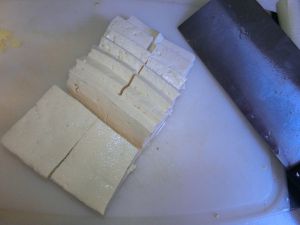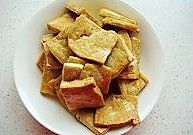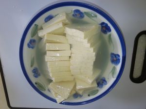 拿个大碗加凉白开后加盐成淡盐水,把豆腐放进去泡10几分钟后,盛出备用
