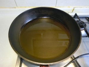倒入油,烧至6成热,将豆腐片下锅煎至两面金黄,盛出控油备用。