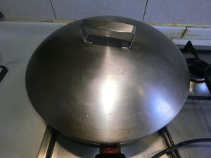 加入大葱,盖上盖子焖1至2分钟,收干汁水后盛出