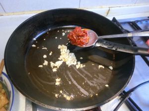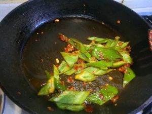 把多余的油倒出,留底油下姜蒜末、郫县豆瓣翻炒至炒出红油和香气