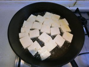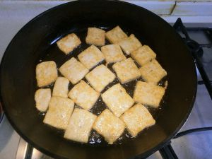 把豆腐放进去煎,等下面煎黄以后再翻面,煎的过程中不要随意翻动