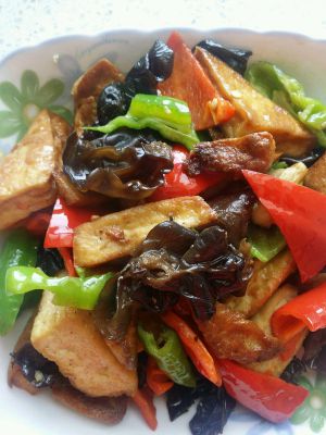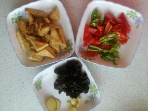 辣椒切成比豆腐小点的三角形,发水木耳撕成小块备用。