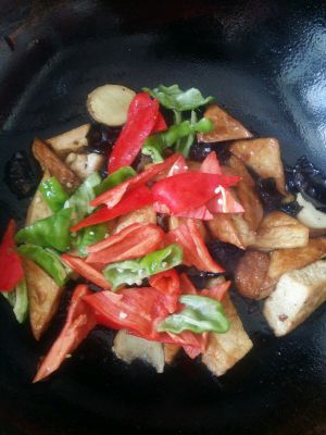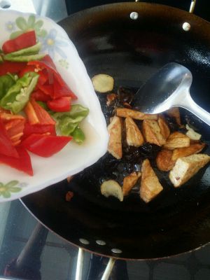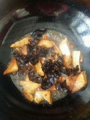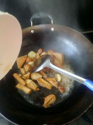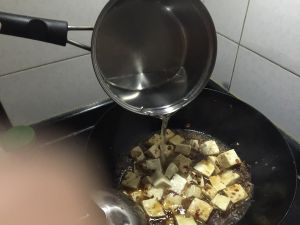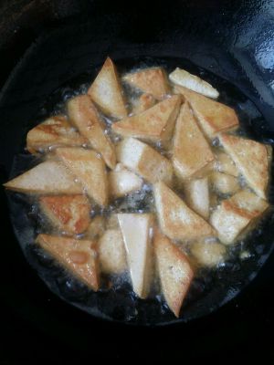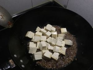 暴香大蒜生姜后放炸好的豆腐一起翻炒。