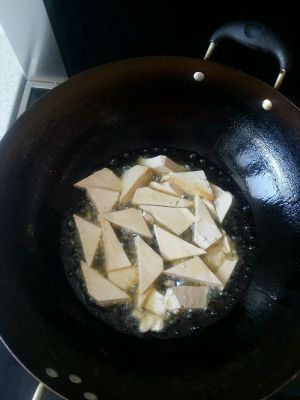 豆腐切三角形的块,锅内倒油烧6成热时,放豆腐炸,左右摇晃锅防止豆腐粘锅(不粘锅除外)