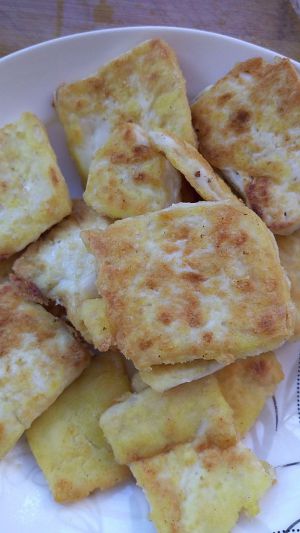 平底锅里放适量油,将粘过淀粉的豆腐一块一块放入