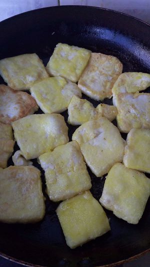 把豆腐切成小块,平底锅里放入适量油,把小块的豆腐放入锅里煎至两面金黄,可以加少许盐,让豆腐有味。
